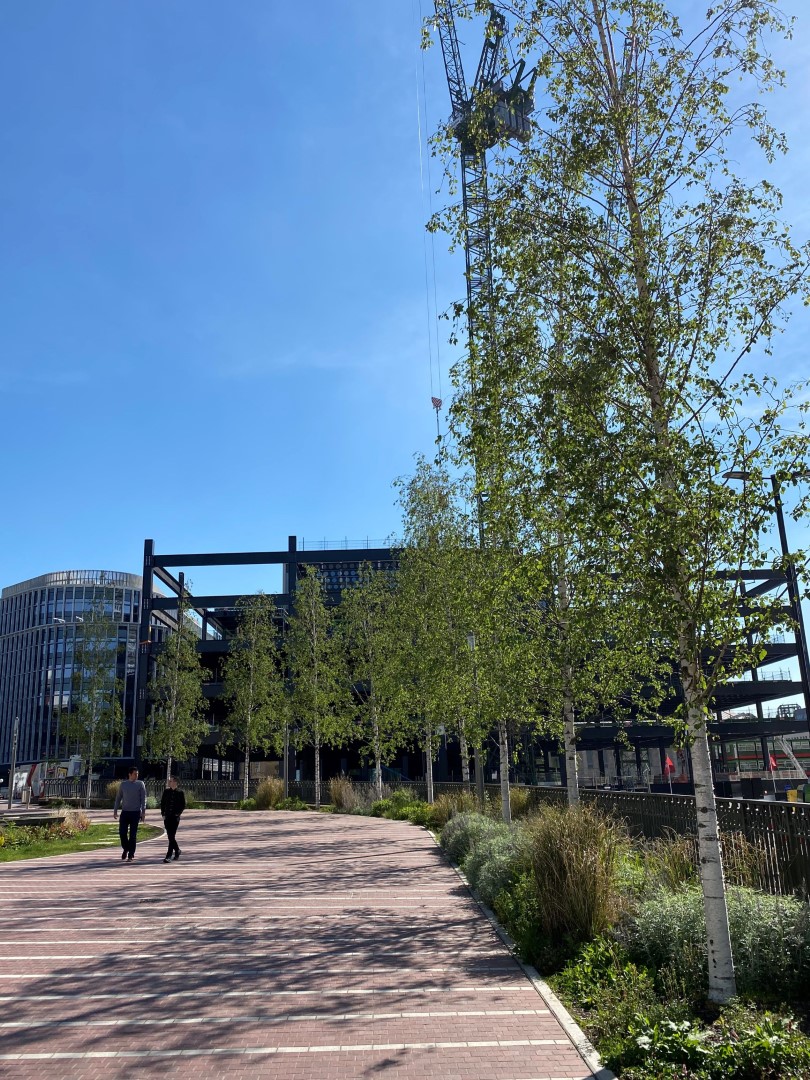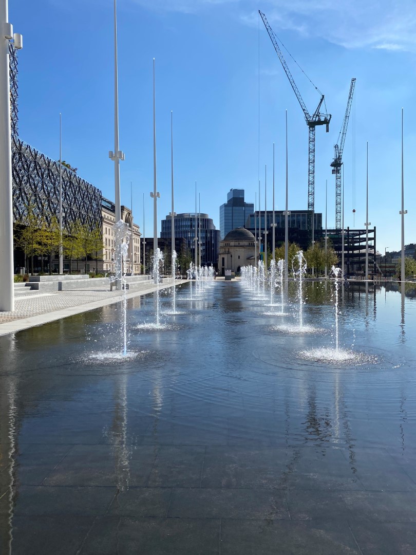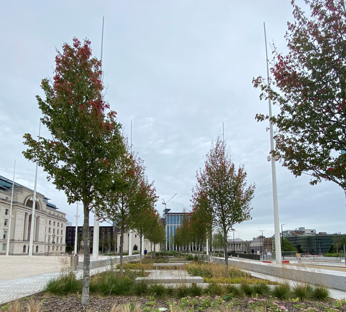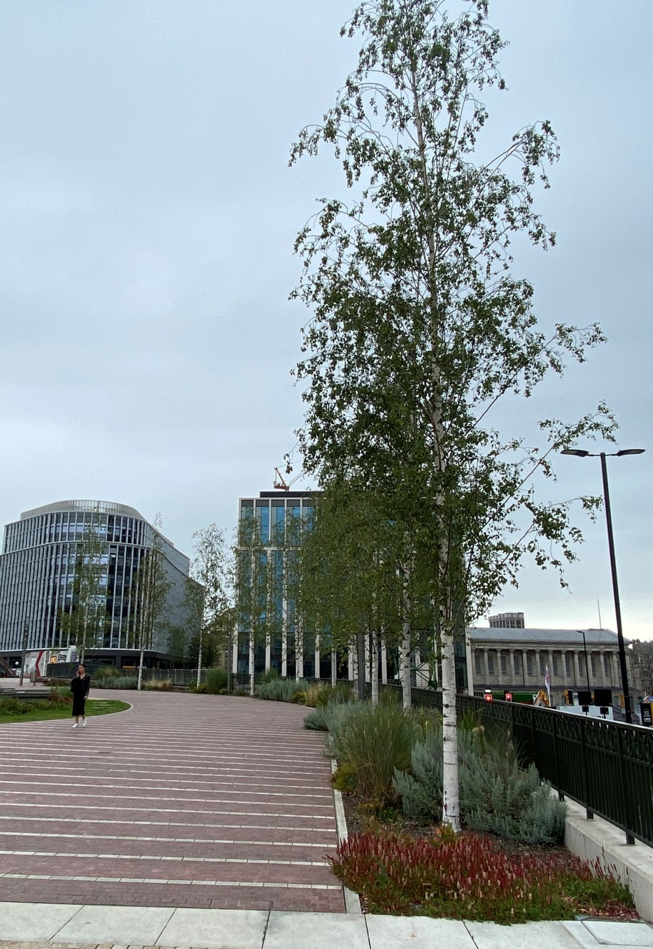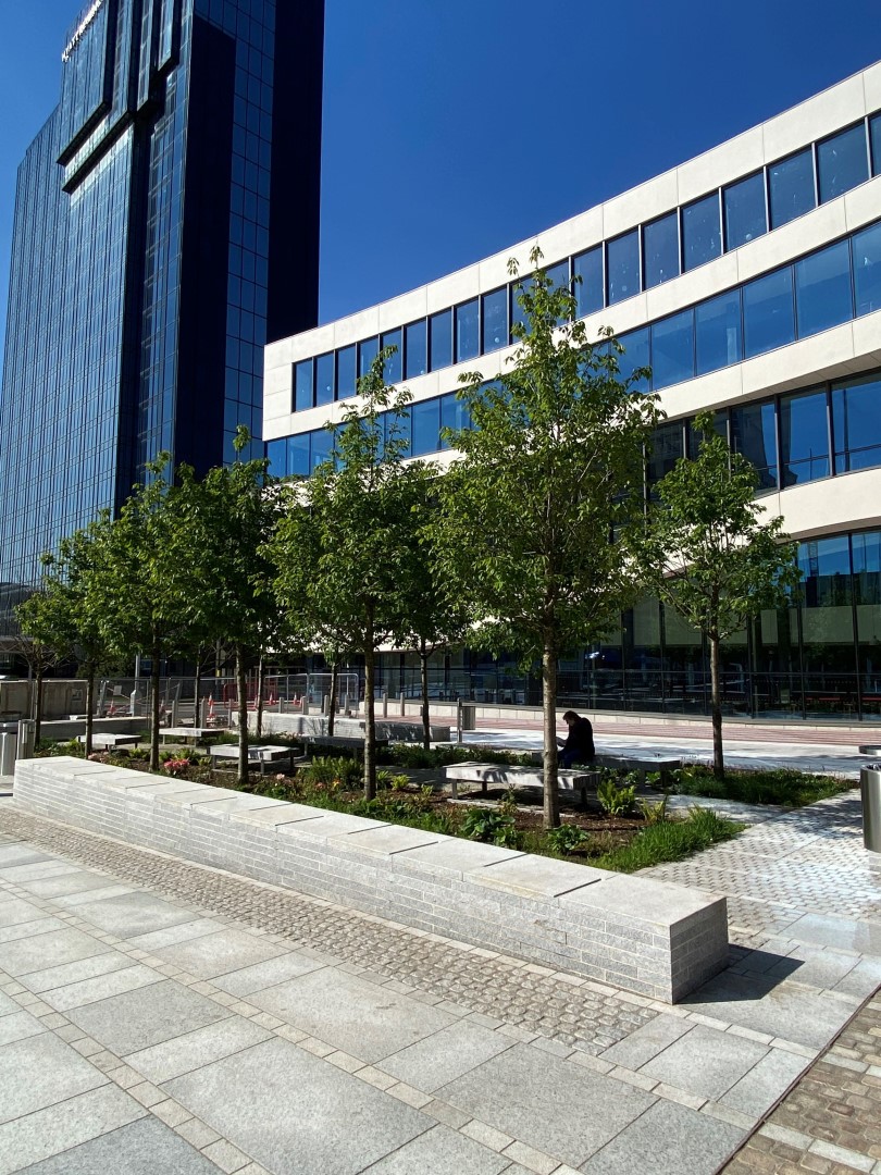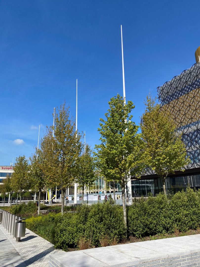 Een prachtige combinatie van bomen, water en moderne architectuur in het historisch centrum van Birmingham. Acer rubrum 'Sun Valley' , Ginkgo biloba en Betula pendula, alle in de maat 50-60, zijn in de winter en voorjaar 2018 door Killingley NT geplant. De foto's zijn gemaakt in augustus 2019.