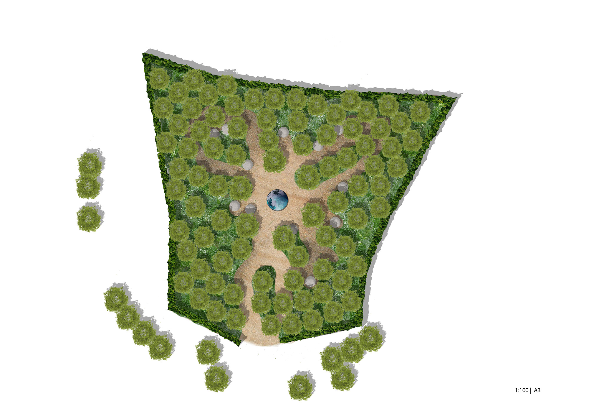 De Nederlandse tuin van ontwerpbureau MAAKspace heeft in de zomer van 2020 een Coup de Coeur voor hun inzending op het FESTIVAL INTERNATIONAL DES JARDINS in Chaumont-sur-Loire gewonnen. De internationale vakjury van het jaarlijks terugkerende tuinfestival vond dat de tuin een zeer goede invulling van het thema ´Terug naar moeder aarde´. Door de vele berken, die het licht zacht filteren, hangt er een serene sfeer in de tuin. De schaduwminnende vaste planten zijn in lava geplant en verbeelden de weelderigheid van de natuur. In het midden van de tuin nodigt een grote waterschaal, het symbolisch oog, uit tot reflectie en weerspiegelt de lucht, de bomen en onszelf. Het oog staat symbool voor de wereld en herinnert ons eraan dat moeder aarde bestaat uit ecosystemen waar alle leven een rol in speelt.