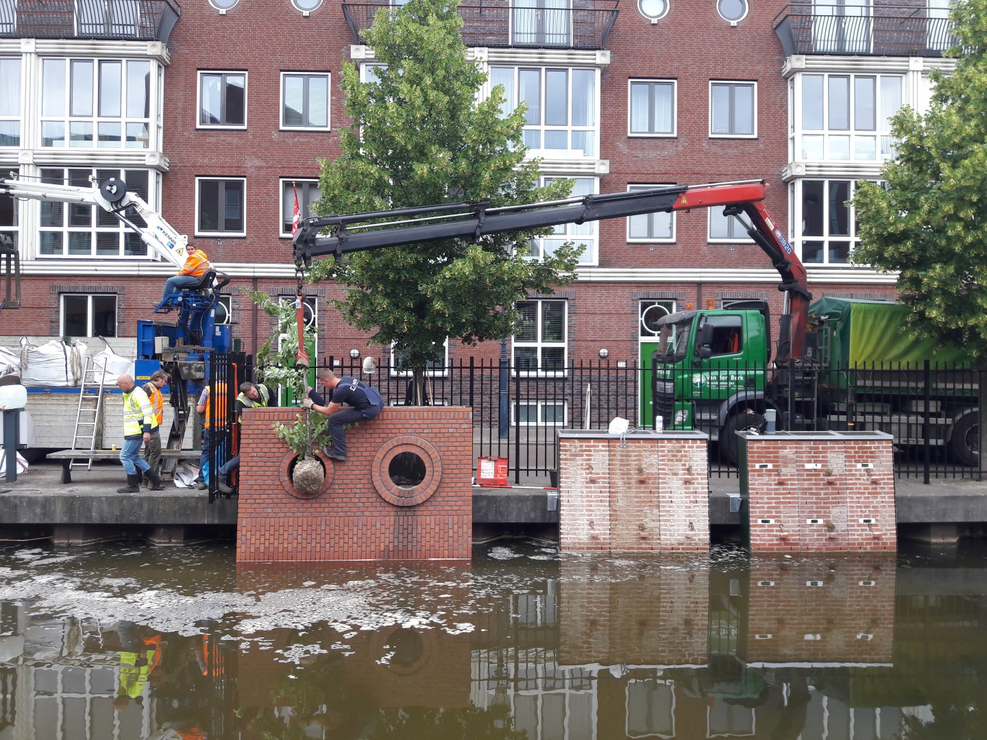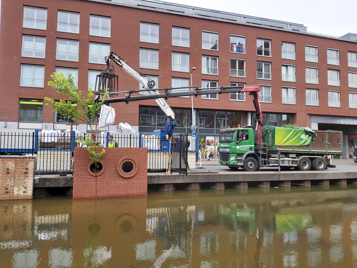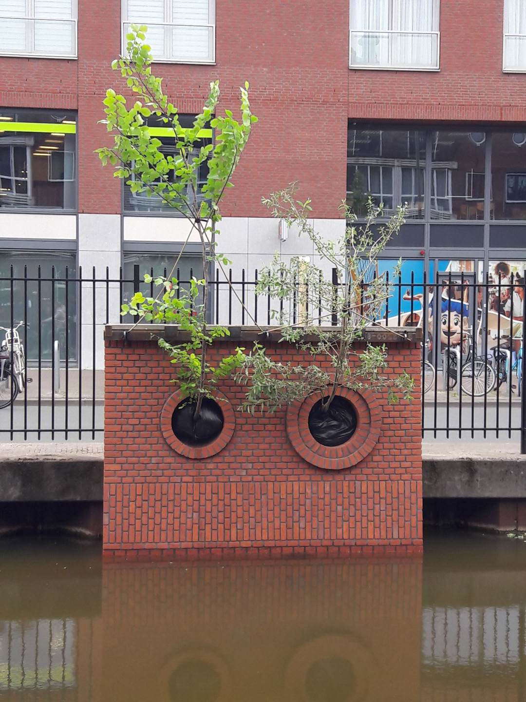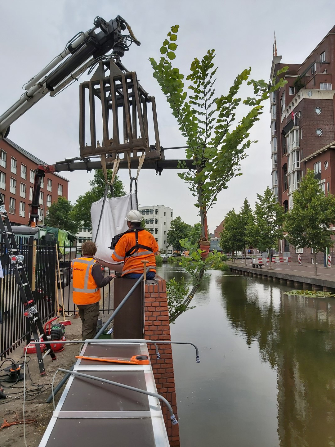 Er zijn bomen met een gebogen stammen gekweekt en samen met TGS is een plan voor de groeiplaats inrichting gemaakt, waarbij het watermanagement van de plaats veel aandacht heeft gekregen. In de proefopstelling zijn twee Salix cinerea en twee Ulmus laevis in speciaal ontworpen, onzichtbare bakken achter de kademuren geplant. De komende maanden zullen we de bomen zorgvuldig monitoren. De resultaten van de test zullen de definitieve vorm van het GreenQuays project bepalen, waarna dit de komende jaren over de totale lengte langs alle kademuren van de Nieuwe Mark zal worden gerealiseerd. Meer over dit project is te lezen op www.greenquays.nl