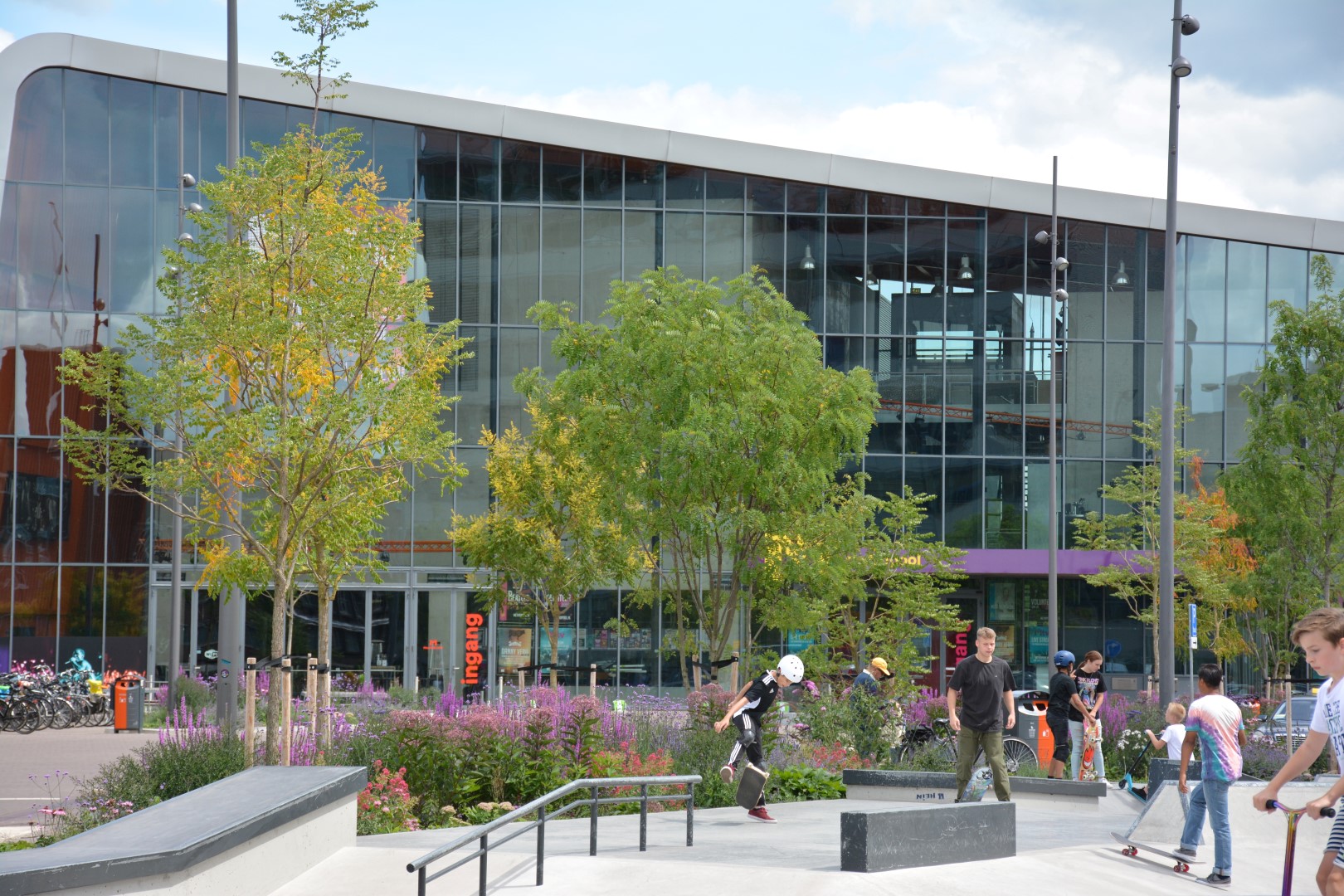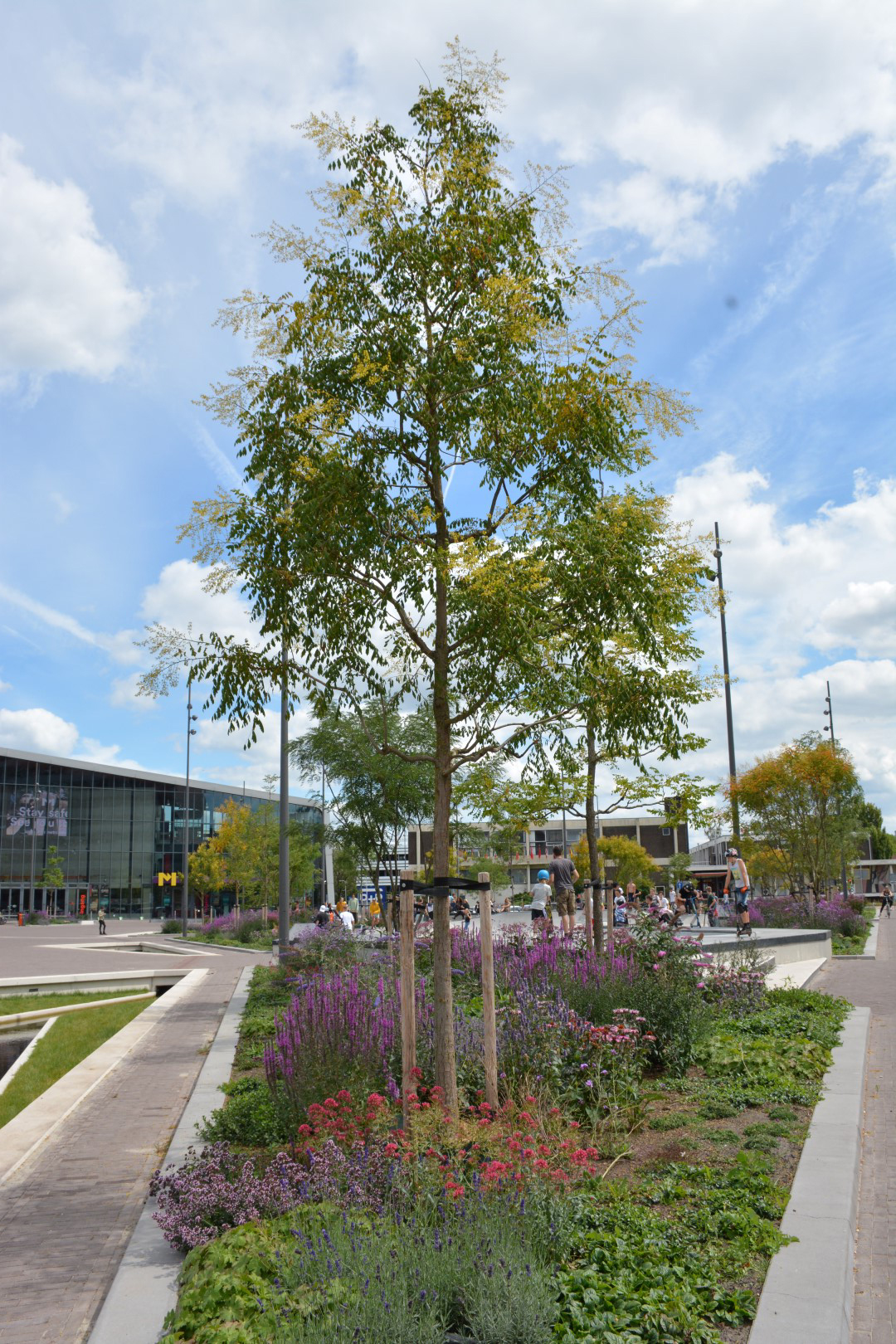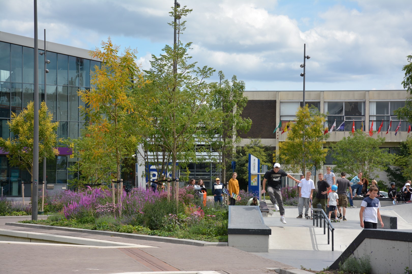 De foto's zijn gemaakt in de eerste zomer na aanplant. De bomen moeten zich nog herstellen van de verplanting en zich verder ontwikkelen, maar de beplanting laat hier al een prachtig beeld zien. De komende jaren zal het plein steeds groener worden naarmate de kronen van de bomen verder gaan groeien en daarmee wordt het een steeds prettigere plek om te verblijven. De skatebaan was onmiddellijk bij jeugd uit de hele regio in trek en wordt intensief gebruikt. Een geslaagde transformatie van doorgangsplek naar ontmoetingsplaats.