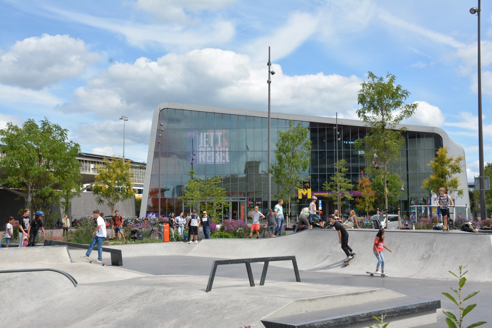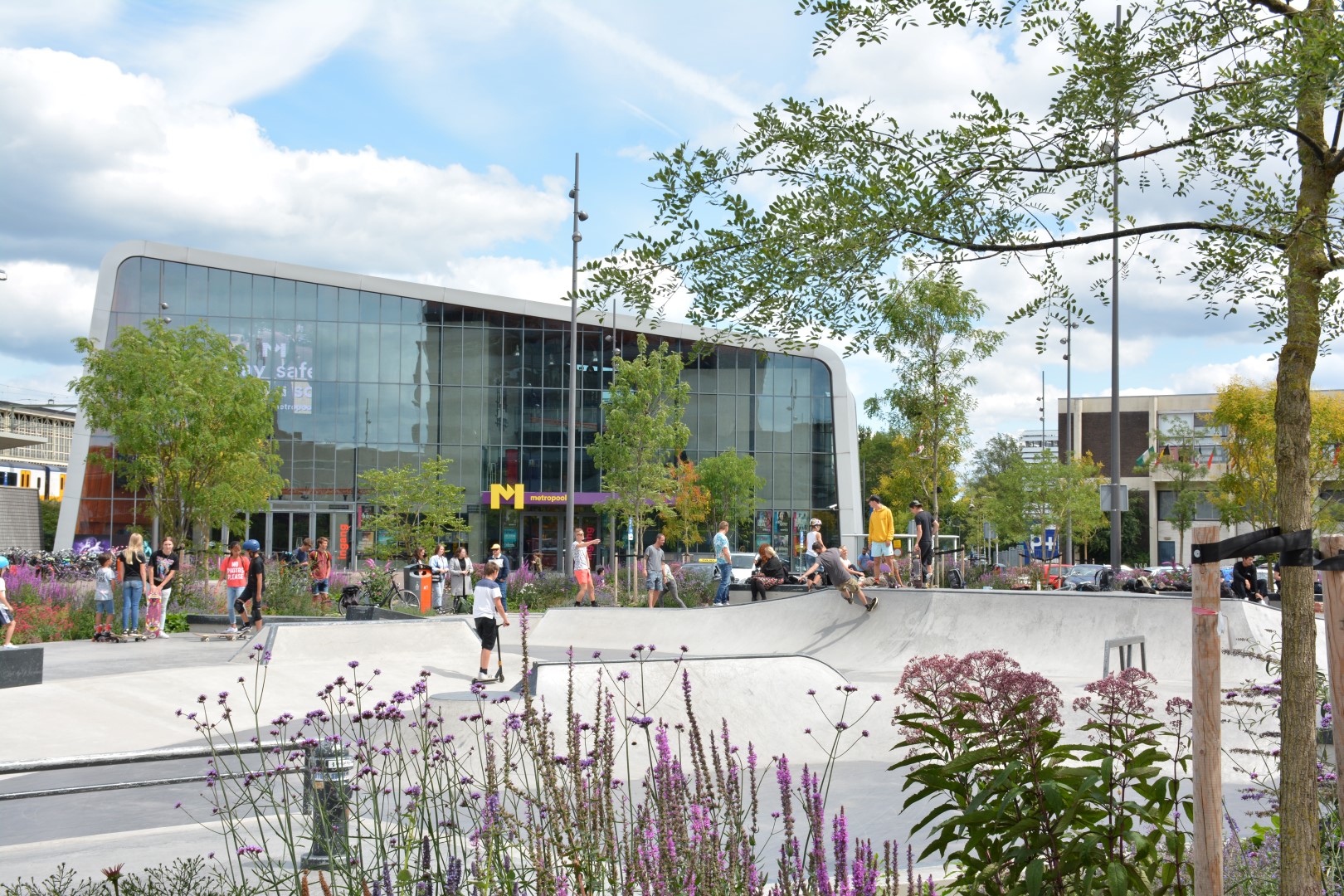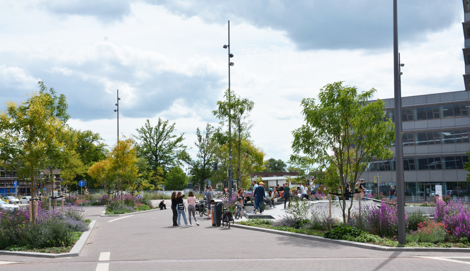 De foto's zijn gemaakt in de eerste zomer na aanplant. De bomen moeten zich nog herstellen van de verplanting en zich verder ontwikkelen, maar de beplanting laat hier al een prachtig beeld zien. De komende jaren zal het plein steeds groener worden naarmate de kronen van de bomen verder gaan groeien en daarmee wordt het een steeds prettigere plek om te verblijven. De skatebaan was onmiddellijk bij jeugd uit de hele regio in trek en wordt intensief gebruikt. Een geslaagde transformatie van doorgangsplek naar ontmoetingsplaats.