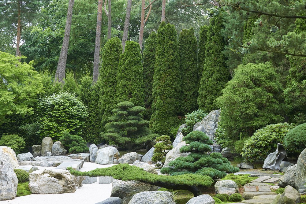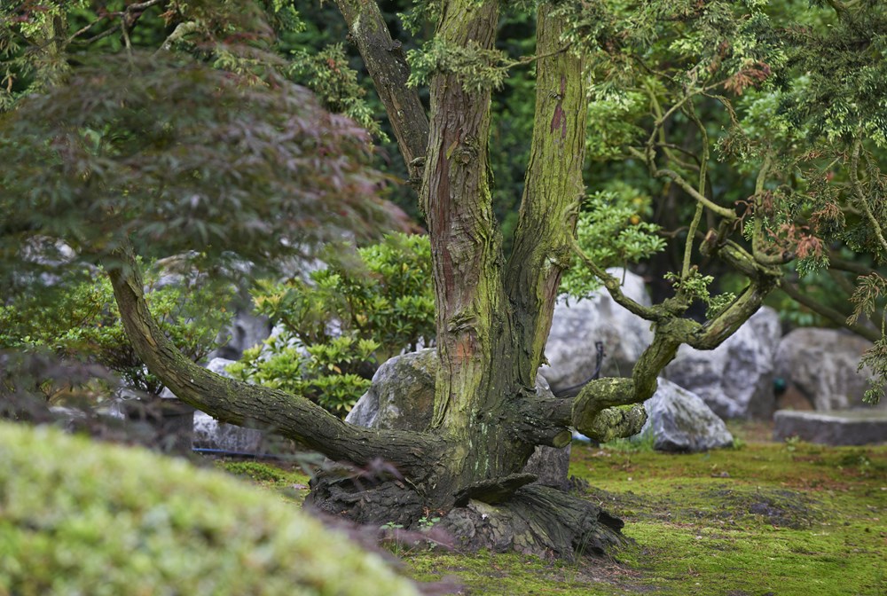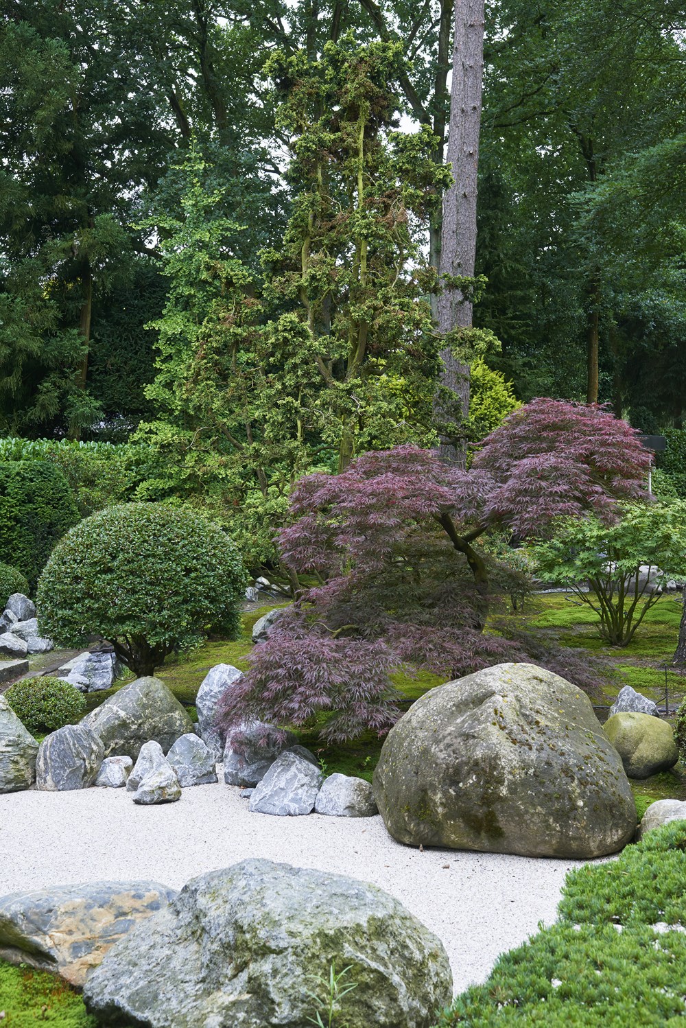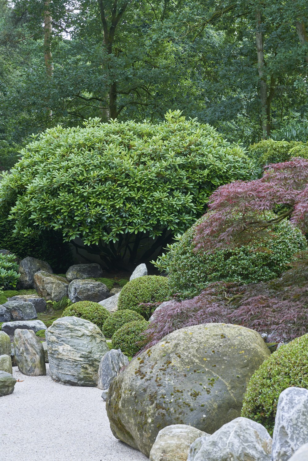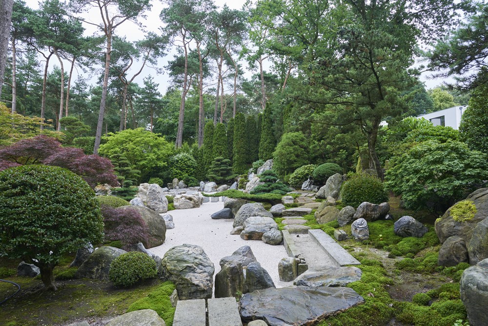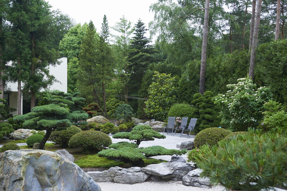 Op de plek van deze tuin in het midden van Nederland was oorspronkelijk een bos. De eigenaresse komt oorspronkelijk uit Japan en heeft het ontwerp zelf gemaakt en ook de realisatie grotendeels voor haar rekening genomen. Ze koos voor veel groenblijvende bomen en struiken. Een breed assortiment aan coniferen werd aangeplant, afgewisseld met groepen rhododendrons. Voor de ultieme Japanse sfeer werden enkele macro bonsai bomen uitgezocht. Het resultaat is volgens onze tuinfotograaf de allermooiste Japanse tuin die hij ooit heeft gezien!