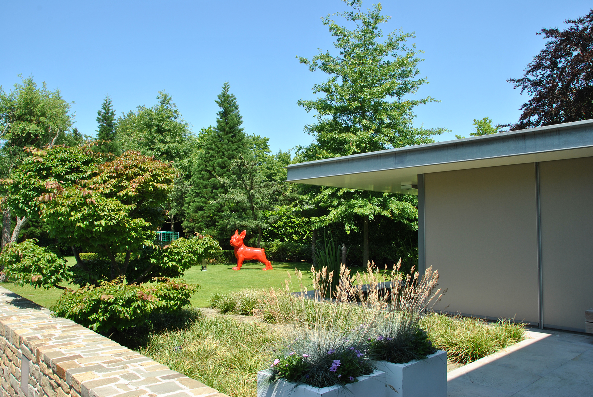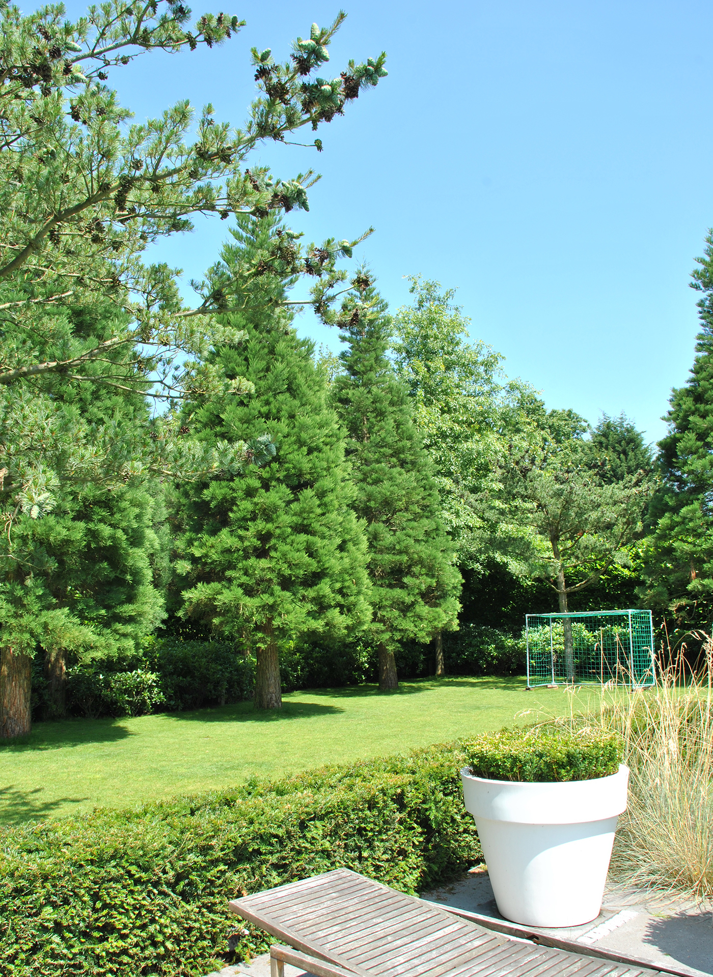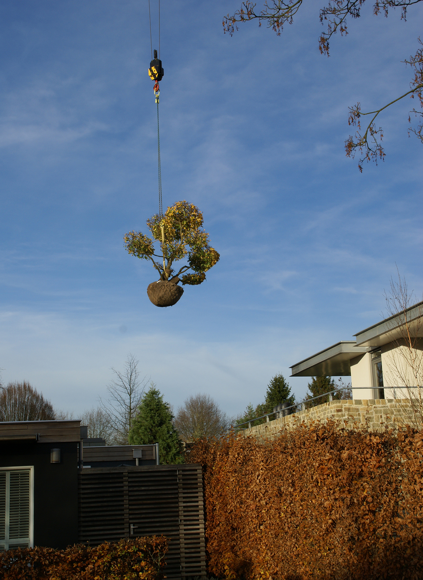 De bewoners van deze tuin in een woonwijk in Brabant wilde graag privacy. Tuintechnisch Bureau Smeulders tekende voor het ontwerp en zocht met zijn klant in de kwekerij forse bomen uit, om het zicht op de achterburen weg te nemen. De keuze viel op Sequoiadendron giganteum (mammoetboom), welke ook in de winter groen blijft. Daarbij o.a. een moeraseik, kurkeik en als blikvanger een macro-bonsai van Parrotia persica. Langs de randen zijn grote groepen, ook groenblijvende, rhododendrons aangeplant. De bomen werden met een telescoopkraan over het huis getild. Na aanplant leek de tuin al direct vele jaren oud.