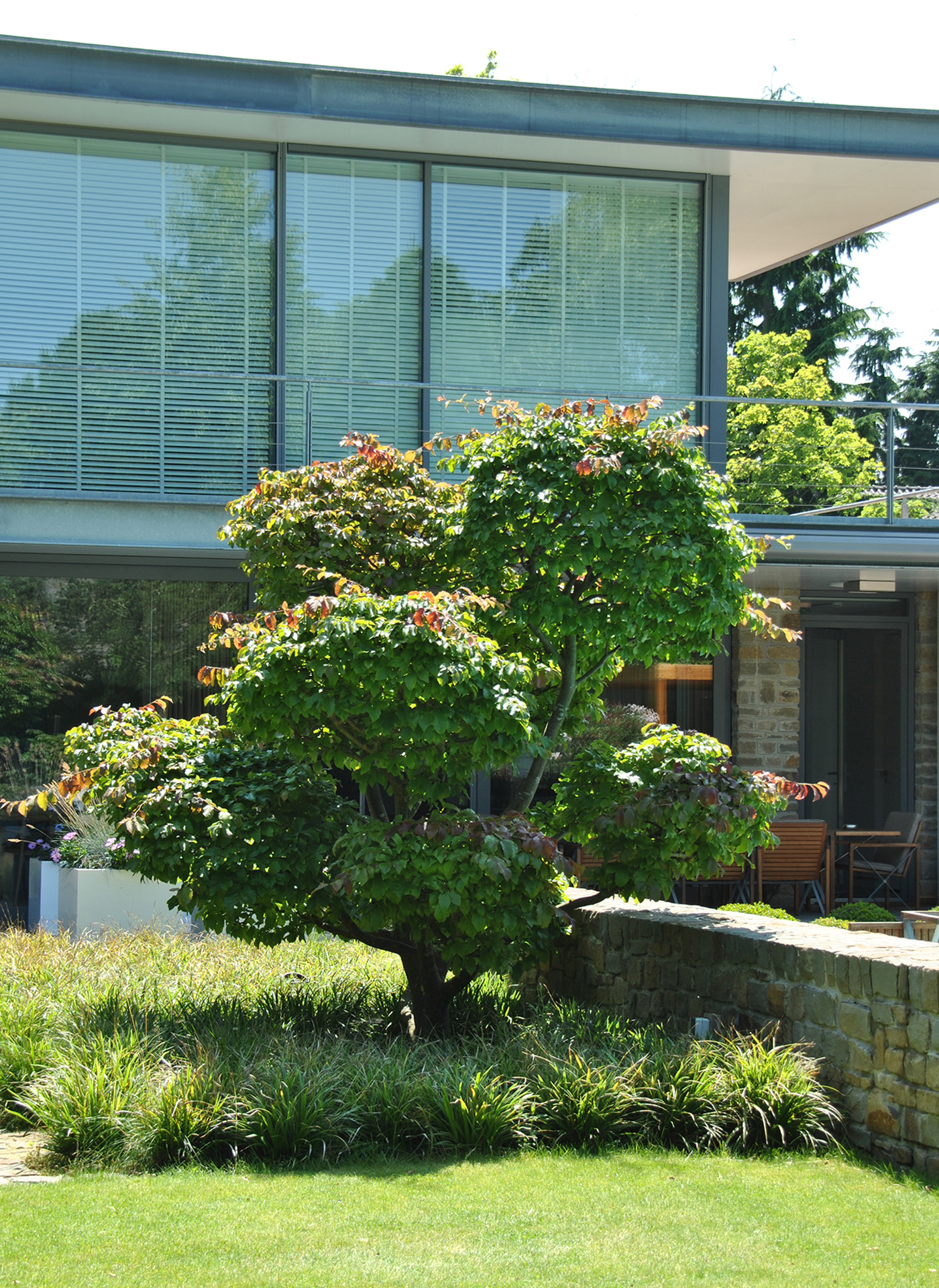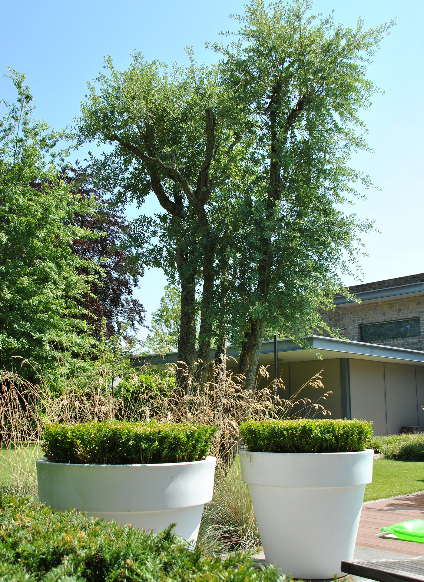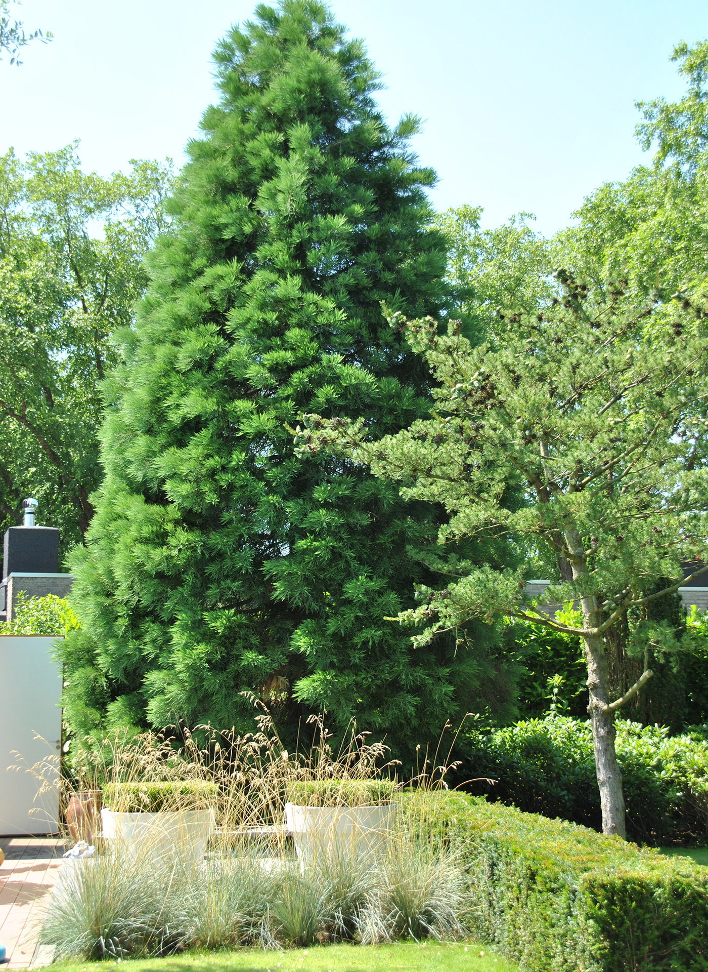 De bewoners van deze tuin in een woonwijk in Brabant wilde graag privacy. Tuintechnisch Bureau Smeulders tekende voor het ontwerp en zocht met zijn klant in de kwekerij forse bomen uit, om het zicht op de achterburen weg te nemen. De keuze viel op Sequoiadendron giganteum (mammoetboom), welke ook in de winter groen blijft. Daarbij o.a. een moeraseik, kurkeik en als blikvanger een macro-bonsai van Parrotia persica. Langs de randen zijn grote groepen, ook groenblijvende, rhododendrons aangeplant. De bomen werden met een telescoopkraan over het huis getild. Na aanplant leek de tuin al direct vele jaren oud.