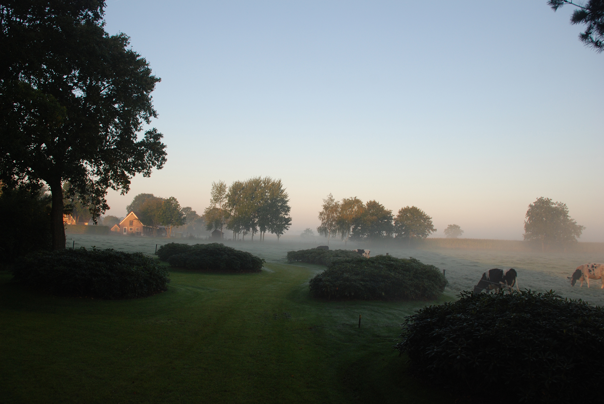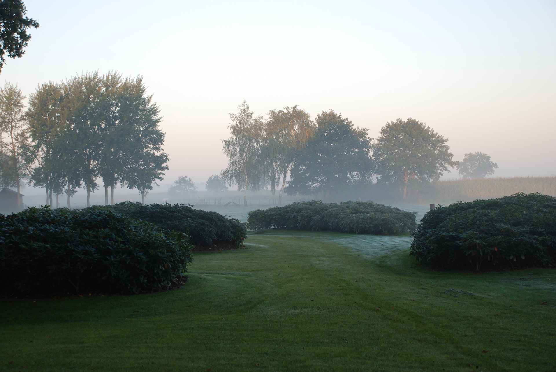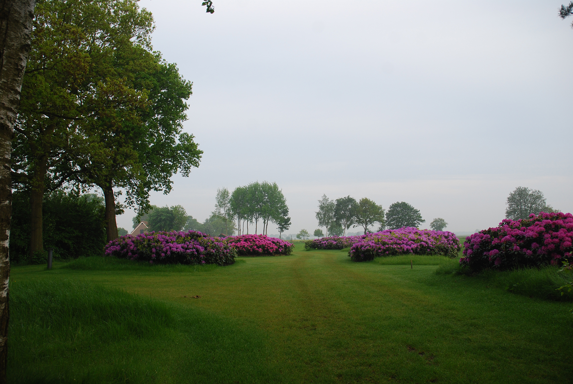 Hier ziet u een bijzondere toepassing van rhododendrons. In deze landschappelijke tuin moeten bij gelegenheid veel auto’s kunnen worden geparkeerd, maar de opdrachtgever wilde wel graag dat de tuin een groen karakter zou behouden. Loek Hoek maakte een ontwerp met grasbetontegels. Om de grote oppervlakte te breken maakte hij gebruik van grote groepen rhododendrons. In de tussenliggende vlakken kan wanneer nodig worden geparkeerd. Van den Berk Rhododendron GmbH leverde voor deze tuin Rhododendron catawbiense ‘Boursault’, Rh. cat. ‘Grandiflorum’ en Rh. ‘Roseum Elegans’.
