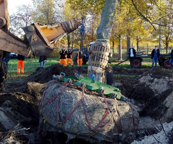 Stedelijke ontwikkelingen vereisen regelmatig de aanplant of het herplanten van grote bomen. Van den Berk Boomkwekerijen is gespecialiseerd in het kweken van medium tot zeer grote bomen en we leveren deze door heel Europa. Wij weten daarom als geen ander hoe je dergelijke maten bomen moet hanteren zonder deze te beschadigen. We hijsen de bomen met kranen en gebruiken diverse hulpmiddelen en hefmethodes, afhankelijk van het type en de grootte van de boom en de tijd van het jaar. De bomen worden met een loopkat, loader of telekraan zorgvuldig geladen zodat ze in de best mogelijke conditie op locatie aankomen. Meestal houdt onze verantwoordelijkheid daarmee op, maar we vinden het belangrijk dat de bomen ook zonder beschadigingen worden gelost en op de juiste manier worden geplant. Alleen dan zullen de bomen een goede hergroei vertonen en hun waarde aan het project toevoegen. Om onze (internationale) afnemers te ondersteunen bij het realiseren van succesvolle groenprojecten, organiseren we trainingen om onze kennis over te dragen.